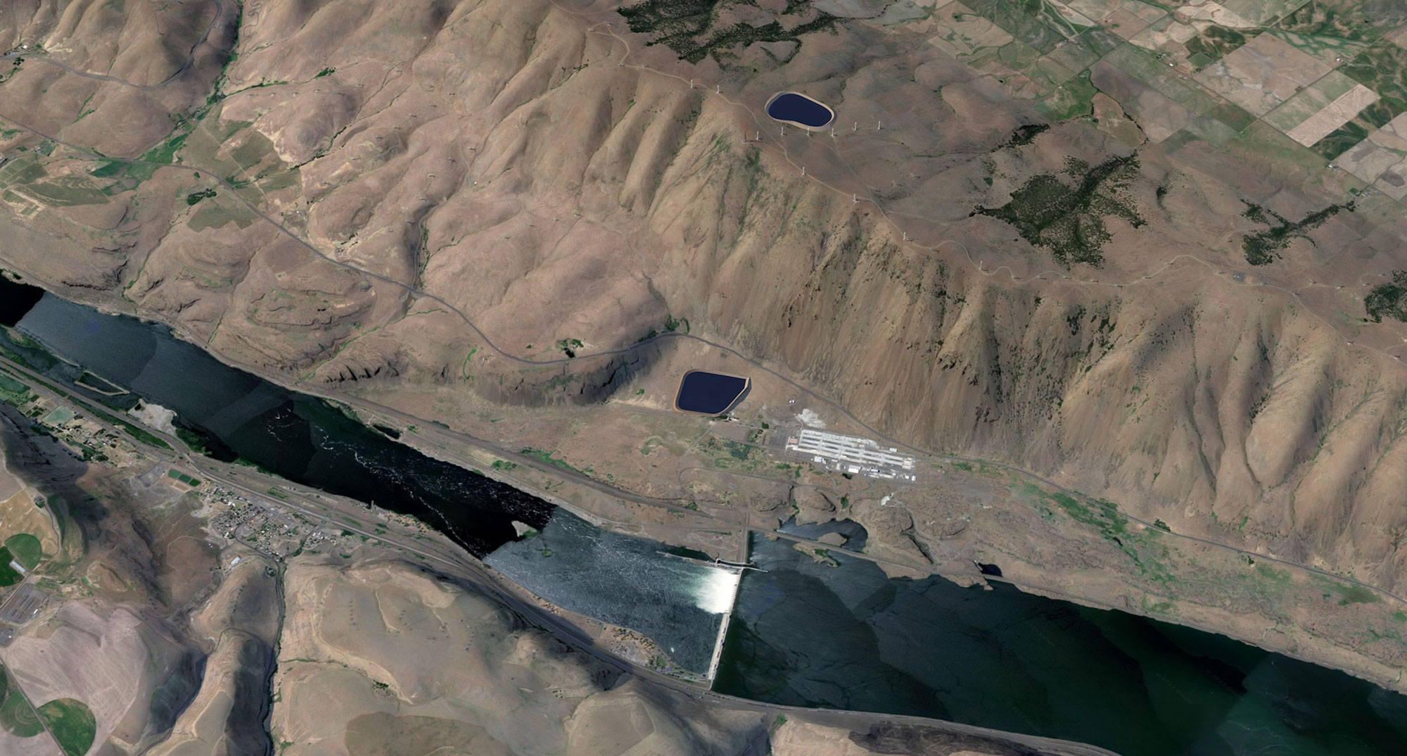 The idea is both simple in concept and bold in execution. It would involve constructing two 65-acre ponds, one on the former site of the smelter and one at the top of the cliff. Each would hold 7,000 acre-feet of water. During the times when wind blows well, and the many wind turbines in the region generate more power than the grid can currently absorb, the energy would be used to pump water from the lower reservoir to the upper reservoir. When the wind dies down, and electricity is needed, water from the upper reservoir can be released through a large pipe, turning a turbine to generate that electrical power as it rushes to the lower reservoir.